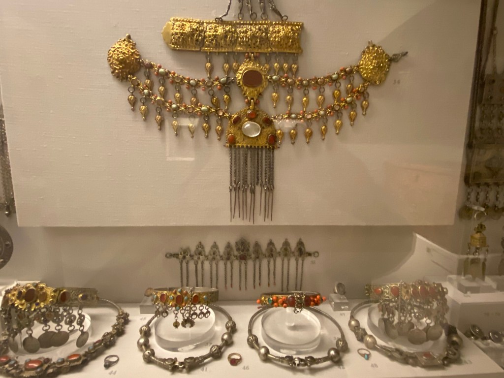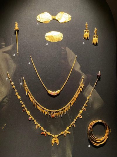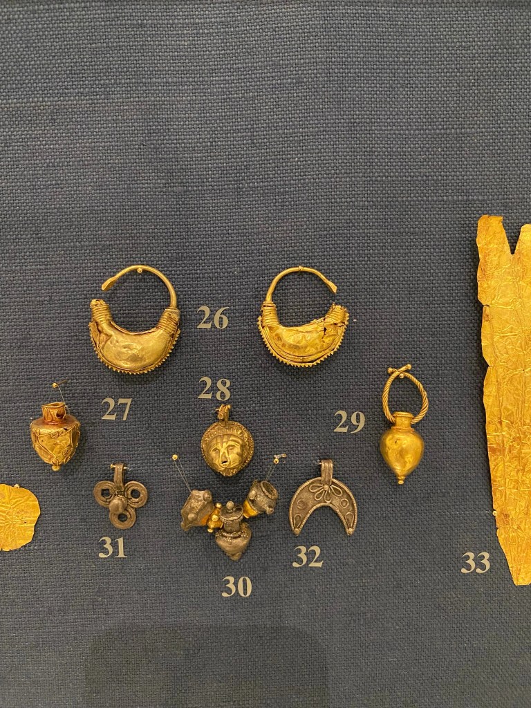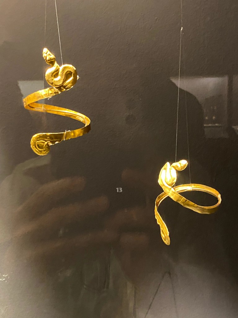 It was a long, quiet gallery. Glowing — golds and silver ancient jewellery, so vibrant they looked like they’d just been placed in a boutique window. Thousands of years old, and yet… shimmering with life.