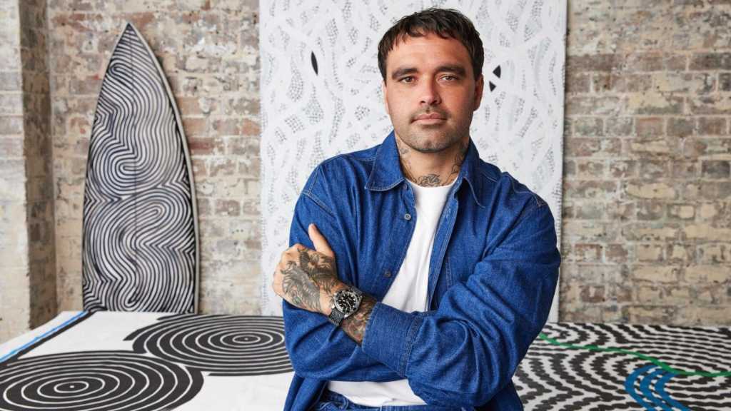 If you want to experience the strength, beauty and depth of contemporary Australian culture, Otis Hope Carey is an artist you need to know. A proud Gumbaynggirr and Bundjalung man, Carey’s work blends the power of First Nations storytelling with bold, modern expression. His large-scale paintings—featuring fluid, wave-like forms—speak to ancestry, healing, connection to Country, and emotion, often rooted in the ocean and water systems of his heritage.